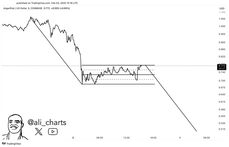 Ali Martinez, WIF’in grafiğinde klasik bir ayı bayrağı oluştuğunu belirtiyor. Bu formasyona göre fiyat 0.78 dolar seviyesinde dirençle karşılaşıyor ve 0.70 dolar seviyesinde destek buluyor. Eğer formasyon beklendiği gibi çalışırsa, WIF 0.51 dolar seviyesine kadar düşebilir.
