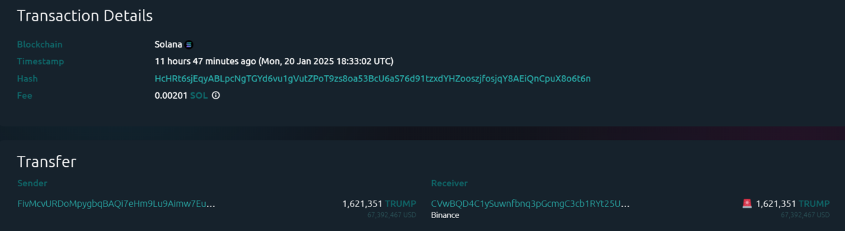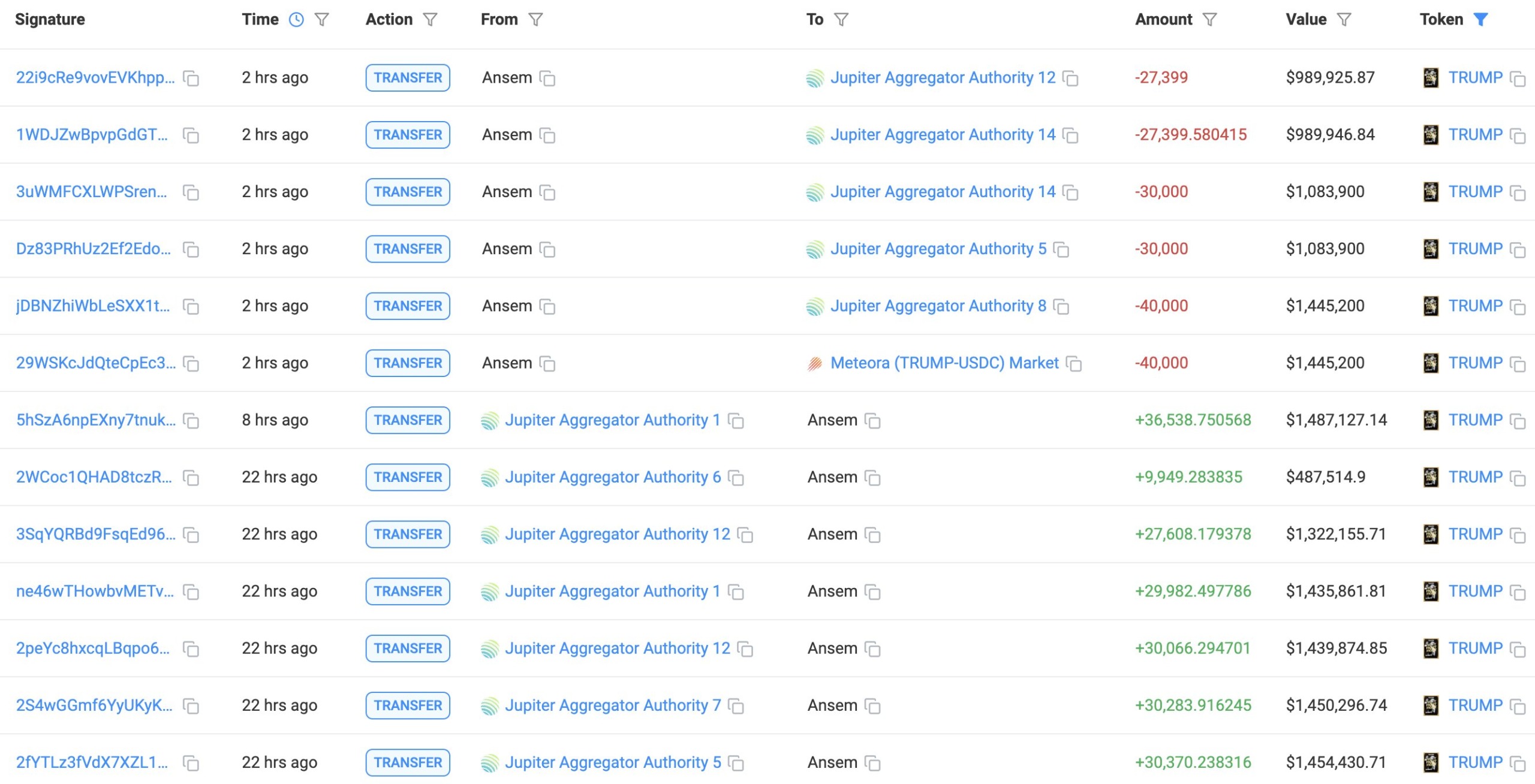 TRUMP tokenlerinin satış ya da transfer işlemlerini gösteren toplam iki işlem ortaya çıktı. Bunlar toplu olarak 74,22 milyon dolar değerinde ve Donald Trump’ın ikinci kez yemin ettiği ABD Başkanlık Yemin Töreni’nin hemen ardından gerçekleşti. Lookonchain tarafından bir X gönderisi aracılığıyla bildirilen ilk işlem, Ansem adlı bir cüzdanın yaklaşık 6,83 milyon dolar değerinde 194.799 TRUMP token sattığını vurguladı. Ansem bu tokenları 48,14 dolardan satın almak için 9,38 milyon USDC harcamıştı. Cüzdan bunları 35,04’ten satarak yaklaşık 2,55 milyon dolar kaybetti.
