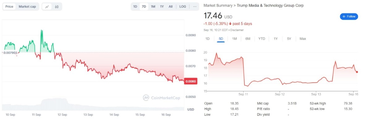 KAMA 1 günlük fiyat grafiği. Kaynak: CoinMarketCapÖte yandan KAMA’nın talihi, Trump Media hisselerinin performansına ilginç bir ayna tutuyor. Çünkü, bu hisseler, Başkanlık yarışına ve onun iniş çıkışlarına karışmış en büyük varlık. DJT, 10 Eylül münazarasının ardından hızla çöktü. Bu, yatırımcıların Cumhuriyetçi adaydan etkilenmediğini gösteriyordu. Horris meme coin fiyat hareketi göz önüne alındığında Harris’in takipçileri için de aynı şey söylenebilir. Buna ek olarak, DJT 13 Eylül Cuma günü ve sonrasında toparlandı. Bu da Trump destekçilerinin safları sıklaştırma ve adaylarını destekleme konusundaki istekliliğini gösteriyor.