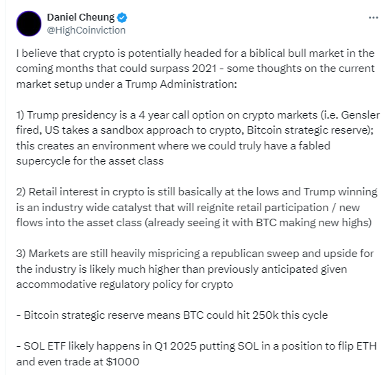 Kriptokoin.com’dan takip ettiğiniz üzere, piyasada Donald Trump rüzgarı esiyor. Trump, ikinci bir dönem için Beyaz Saray’a dönmeyi başardı. Kripto paralara ilişkin son olumlu açıklamalarının da etkisiyle kripto yanlısı politikalara yönelik beklentiler artıyor. Bu durum, ABD başkanlığını kazanmasının yakında bir Solana borsa yatırım fonunun (ETF) onaylanmasına yol açabileceği umudunu doğurdu. Syncracy Capital’in kurucu ortağı Daniel Cheung, piyasanın potansiyel bir “Cumhuriyetçi süpürmeyi” hafife alıyor olabileceğine inanıyor. Bu bağlamda, bunun SOL’un değerini “önceden tahmin edilenden çok daha yükseğe” çıkaracağını iddia ediyor. Cheung, detaylı açıklamasında altcoin için şunları söylüyor: