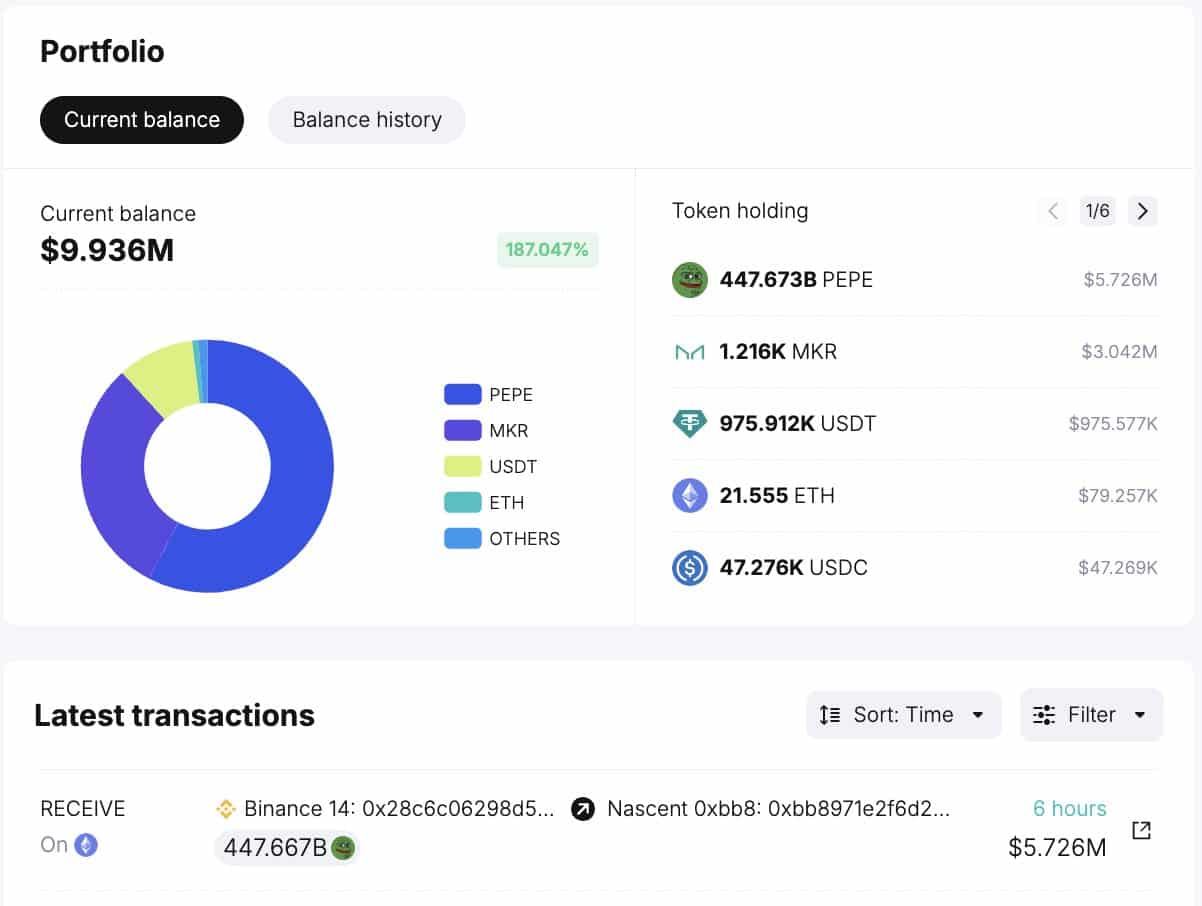 Spot On Chain takibi, Nascent’in ilk PEPE yatırımı olarak Binance’ten 447,67 milyar PEPE token’ı (5,48 milyon dolar) satın aldığını ortaya koyuyor. Token’ların mevcut değeri %4,8’lik bir kâr (262.000 dolar) gösterdiğinden, Nascent’in stratejik hamlesi erken getiri sağlıyor gibi görünüyor. PEPE şu anda Nascent’in portföyünde MKR’ı geçerek zirveye yerleşti ve yatırımlarından elde edilen toplam kâr etkileyici bir şekilde 2,45 milyon dolara (+248%) ulaştı.