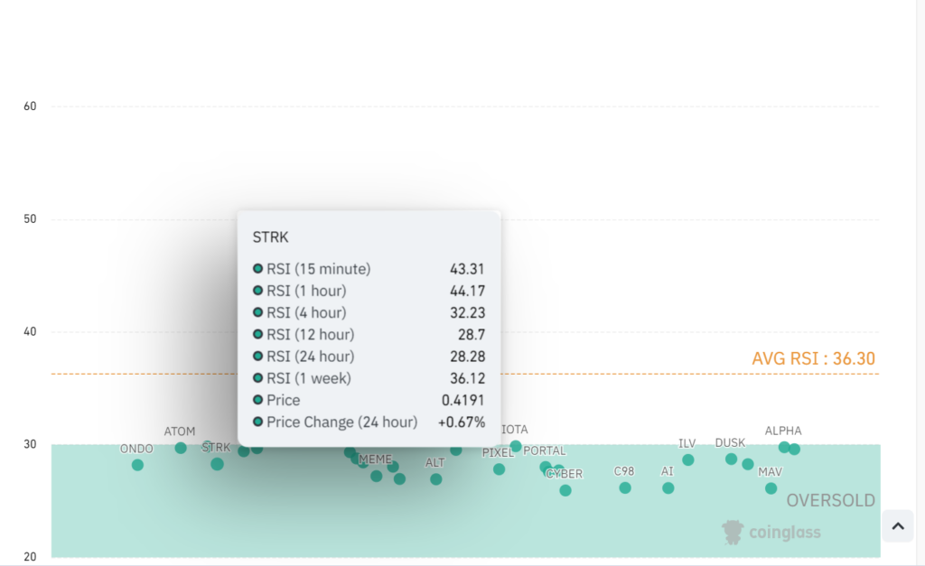 STRK şu anda 0,418 dolardan işlem görüyor. Ayrıca, 24 saatlik RSI değeri 28,28 ile aşırı satım durumuna işaret ediyor. 26,51’lik 14 günlük RSI değeri de bunu teyit ediyor. Böylece, token fiyatının tersine dönmesi için güçlü bir potansiyele işaret ediyor. Çeşitli zaman dilimlerindeki RSI değerleri, 15 dakika için 43,31, bir saat için 44,17, dört saat için 32,23, 12 saat için 28,7, 24 saat için 28,28 ve bir hafta için 36,12, sürekli olarak aşırı satım veya aşırı satıma yakın koşullar göstererek toparlanma potansiyelini güçlendiriyor.