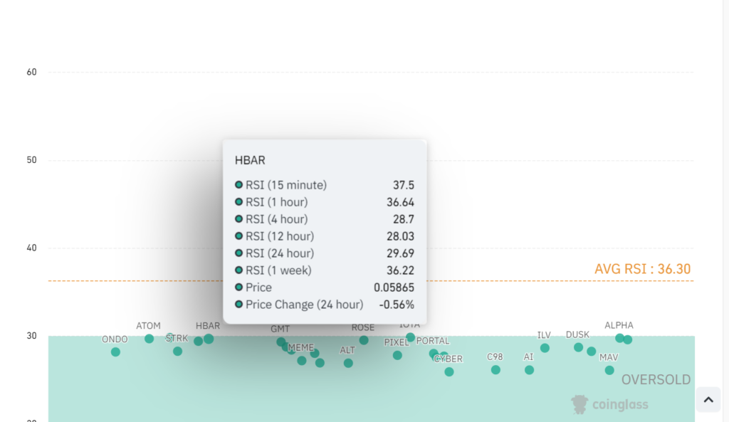 Kripto Piyasası RSI Isı Haritası, günlük grafik: HBAR. Kaynak: CoinGlassMomentum göstergesi aşağı yönlü baskının azaldığına işaret ediyor. Böylece, HBAR’ın mevcut düşüş trendinin sonuna yaklaşıyor olabileceğini gösteriyor. Emtia Kanal Endeksi (CCI) ve Ortalama Yön Endeksi (ADX) nötr durumda. Bununla birlikte, genel teknik göstergeler potansiyel bir toparlanmayı destekliyor. HBAR’ın derin aşırı satım durumu, bu alım sinyalleriyle birleştiğinde, fiyat toparlanması için iyi bir konumda olduğunu gösteriyor.