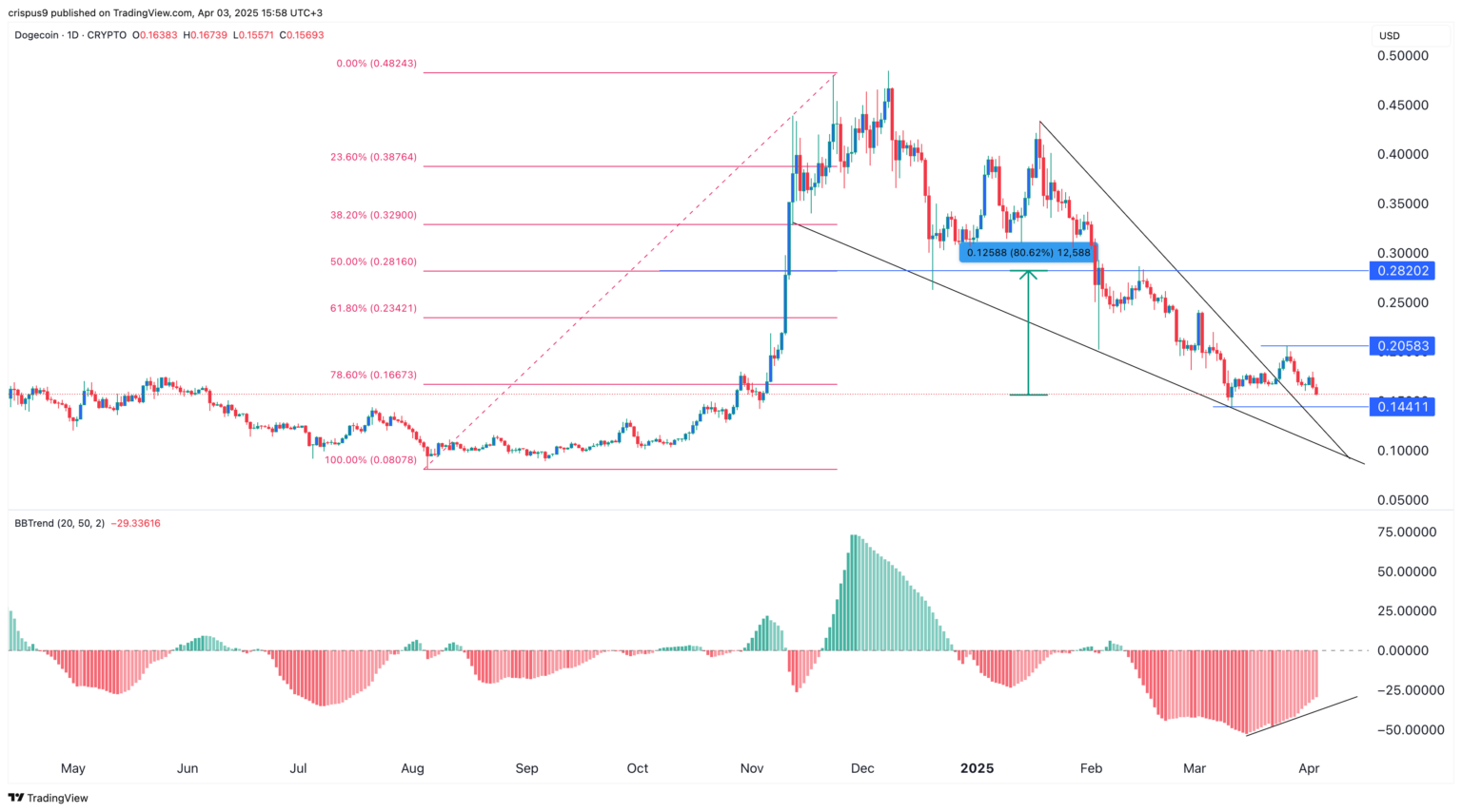 Dogecoin fiyatı, bugün de düşüş trendini sürdürerek geçen yıl Kasım ayından bu yana en düşük seviyelerine yakın seyrediyor. Bu düşüş, büyük ölçüde Donald Trump’ın kapsamlı vergileri uygulaması sonrası yatırımcıların yaşadığı endişelerden kaynaklanıyor. Ayrıca, Elon Musk’ın bu yıl DOGE projesini terk edebileceği olasılığının Polymarket’te artması da fiyat üzerinde baskı yaratıyor.