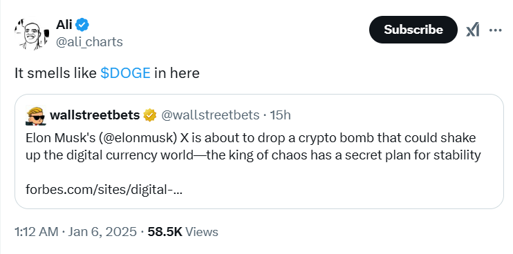 X Money’nin planlanan lansmanı, Dogecoin için güçlü bir yükseliş sinyali vermekte. Piyasa analisti Ali Martinez, Musk’ın Dogecoin’e desteğine atıfta bulunarak “Burada DOGE kokusu var” dedi. Ayrıca Musk’ın şifreli sosyal medya güncellemeleri, ABD’de bir “Dogecoin Rezervi” oluşumuna dair söylentileri körükledi. Aynı zamanda, Musk’ın başkanlığını yaptığı ve Dogecoin kısaltmasına (D.O.G.E.) benzer bir isme sahip yeni bir hükümet birimi, kripto pazarında büyük tartışmalara neden oldu.