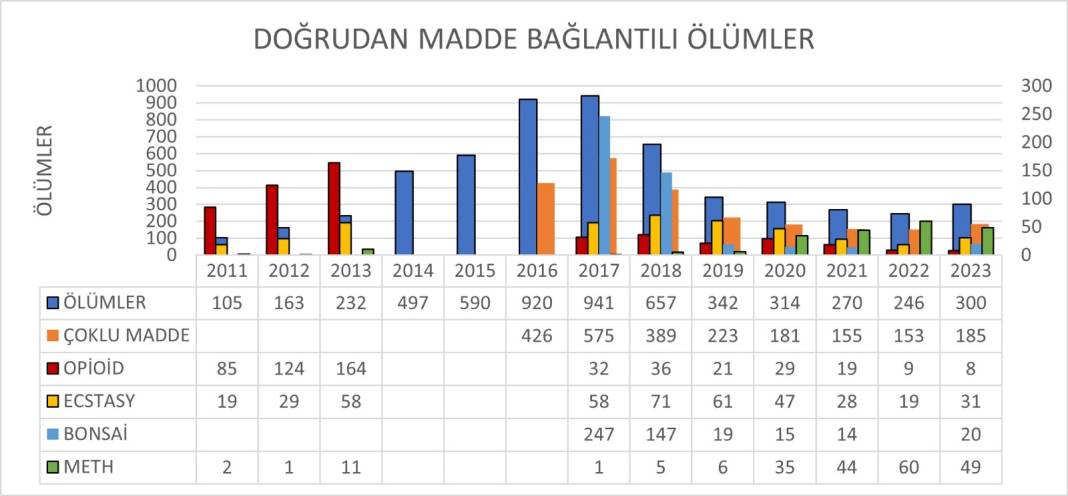 Madde bağlantılı ölümler yeniden artarken, ölümlerin yarısında metamfetamin yer aldı. 300 doğrudan madde bağlantılı ölümden 278’i Türk vatandaşlarından oluştu. Doğrudan metamfetaminden 49 kişi öldü, kayıtlara “çoklu madde” diye geçen ölümlerle birlikte 148 vakada metamfetamin vardı.