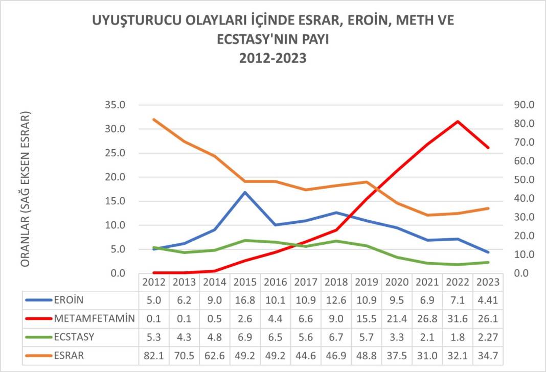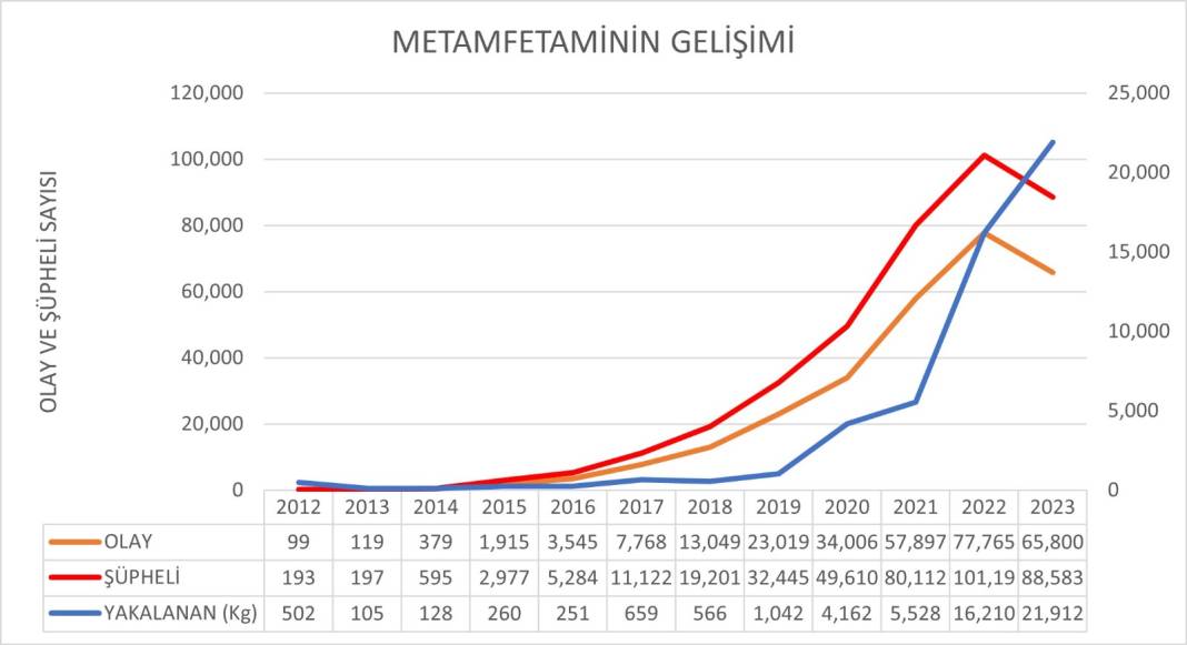 Kaçakçılıktaki bu artışa rağmen metamfetamin olayları ve şüphelilerinin sayısındaki yüzde 30 civarında gerileme dikkat çekici.