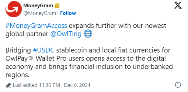 MoneyGram erişimi USDC desteği için OwlTing’i entegre ediyor