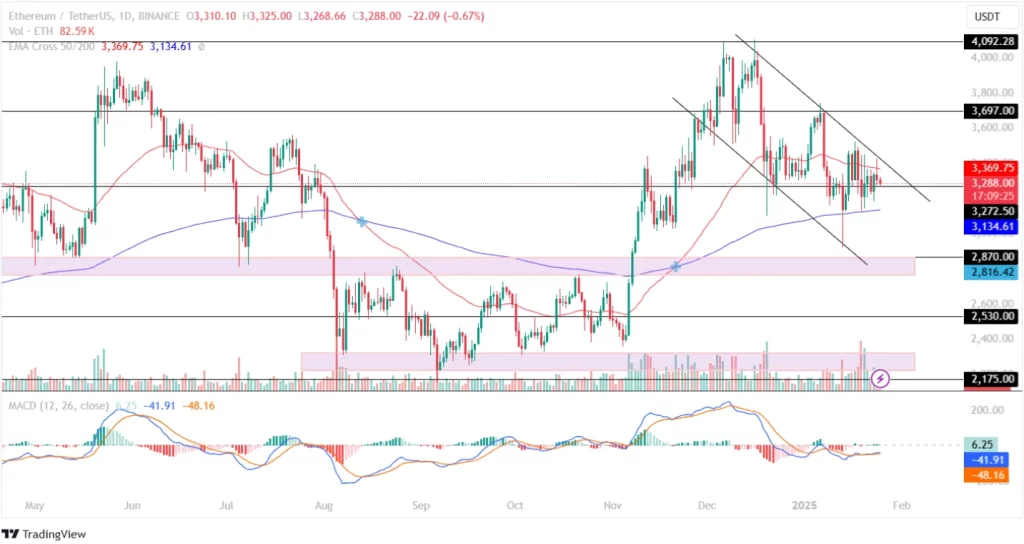 MACD göstergesi nötr bir seyir izlerken, 50 ve 200 günlük üstel hareketli ortalamalar (EMA) da benzer bir eğilimde. Ethereum’un 3.272 dolar seviyesinin üzerinde kalması, fiyatın 3.700 dolara kadar yükselmesini sağlayabilir. Öte yandan, satış baskısının artması durumunda fiyat 3.100 dolara kadar gerileyebilir.