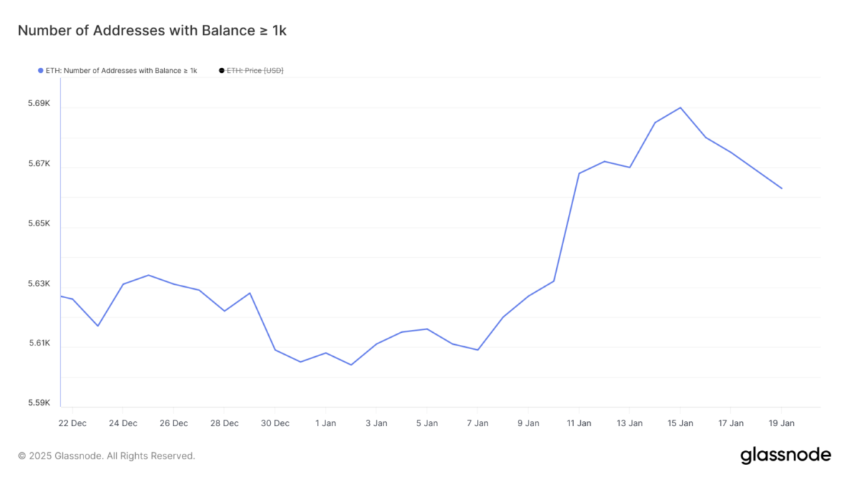 ETH balina adreslerinin sayısı 15 Ocak’ta 11 ayın zirvesi olan 5.690’a ulaştı. Ancak, bu sayı kısa süre içinde 5.663’e düştü. En az 1.000 ETH bulunduran balinalar, piyasadaki genel duyarlılığı ölçmek açısından büyük önem taşıyor. Balinaların satış ya da birikim hareketleri, fiyat trendlerinde değişikliklere işaret ediyor.