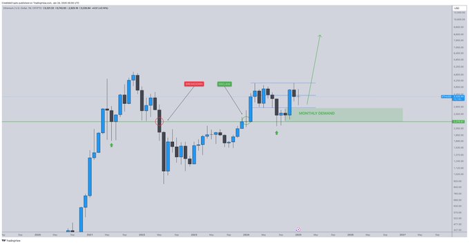 Kriptokoin.com’dan takip ettiğiniz üzere, son yükseliş hamlesinden sonra irtifa kaybetmeye başladı. Bu süreçte Ethereum fiyatı da yaklaşık %2,7 düşüşle 3.298 dolara geriledi. Bununla birlikte lider altcoin’in kaderi değişmek üzere olabilir. Credible Crypto takma adlı popüler analist, Ethereum’un düşüş eğilimine rağmen aylık zaman diliminde yükseliş eğiliminde göründüğünü söylüyor. Analiste göre, Ethereum mevcut fiyattan %195’in üzerinde bir artış gösterebilir. Analist, “Bence 10.000 dolar, bir kez patlak verdiğimizde en az 10.000 dolar. Ayrıca, bence döngünün sonunda 20.000 dolar kesinlikle mantıksız değil.” diyor. Bu bağlamda analist, şu açıklamayı yapıyor:
