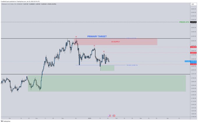 Kripto para piyasası 2025’e güzel bir başlangıç yaptı. Özellikle, kripto dostu Donald Trump’ın ABD Başkanı olarak göreve başlaması piyasadaki iyimserliği artırdı. XRP Coin gibi bazı tokenler muhteşem performans sergilediler. Bununla birlikte, lider altcoin Ethereum beklentileri tam olarak karşılayamadı. Ancak, geniş takipçi kitlesine sahip bir analist, ETH’deki düşüş eğiliminin ortasında yine de yükseliş eğilimi gösteriyor. Analist, ETH için oldukça iddialı fiyat hedefleri veriyor.