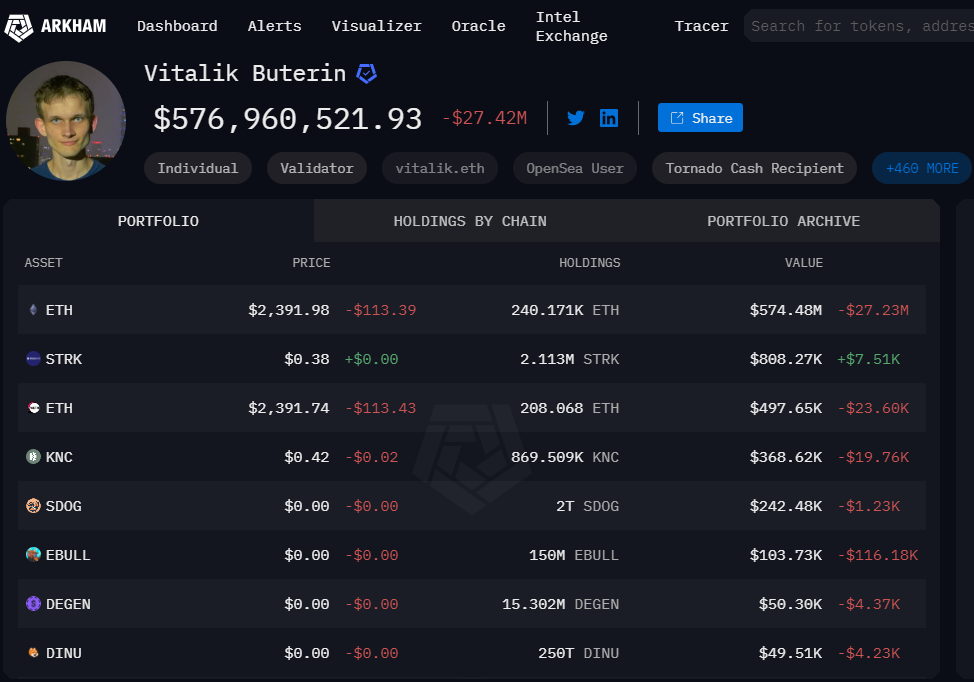Bu yükseliş, Bitcoin (BTC) ve Ethereum (ETH) gibi önde gelen kripto para birimlerinin sırasıyla yüzde 4 ve yüzde 4,7 düşüş gösterdiği bir dönemde yaşanması dikkat çekici. Kripto para piyasasının toplam değeri de yüzde 4,8 azalırken, Starknet’in bu kadar belirgin bir şekilde yükselmesi piyasada bazı soru işaretleri yarattı. Arkham kayıtlarına göre, Vitalik Buterin’in cüzdanında onlarca farklı cinsten toplam 578,9 milyon dolarlık altcoin bulunuyor. Buterin’in portföyünde Starknet (STRK), KNC, SDOG, EBULL, DEGEN ve DINU gibi farklı kripto para birimleri de yer alıyor. STRK, Ethereum ağında ölçeklenebilirlik çözümleri sunan bir proje olup, Buterin’in bu projeye olan inancını gösteriyor. Diğer altcoinler ise daha küçük miktarlarda olsa da portföyde yer alıyor.