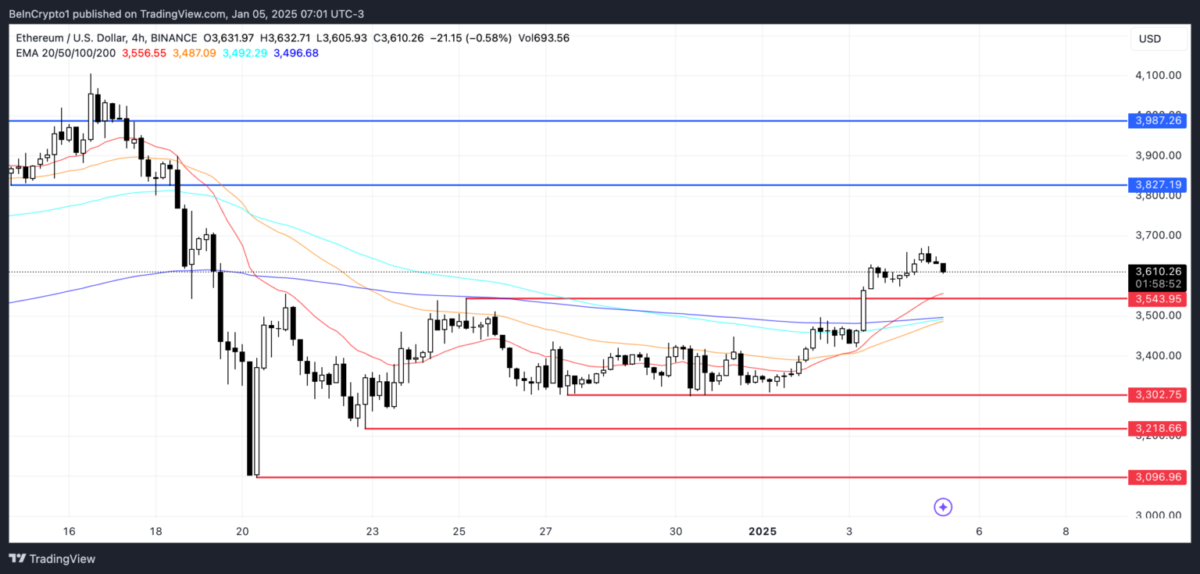 Ethereum, 4 Ocak’ta “golden cross” sinyali oluşturdu. Bu da kısa vadeli EMA’nın uzun vadeli EMA’yı yukarı kesmesiyle ortaya çıkar. Eğer yukarı trend, RSI seviyeleri ve balina hareketleriyle desteklenirse, ETH fiyatı 3.827 dolar direncini test edecektir. Buranın kırılması durumunda boğaların sıradaki hedefi 3.987 dolar olacaktır.