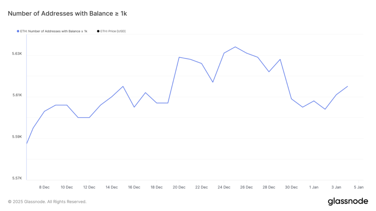 Balinaların hareketleri piyasa trendleri üzerinde oldukça etkilidir. En az 1.000 ETH tutan adres sayısı 25 Aralık’ta 5.634 seviyesine ulaşmıştı. Ardından 2 Ocak’ta 5.604’e düştü. Bu sayı yeniden artarak 5.615’e ulaştı. Bu da büyük yatırımcıların Ethereum’a olan ilgisinin canlandığını gösteriyor. Balina birikimlerindeki artış, fiyatları yukarı çeken bir güven sinyalidir. Aksine, bir düşüş büyük yatırımcıların çekimser davrandığını ve piyasada satış baskısının arttığını gösterir.
