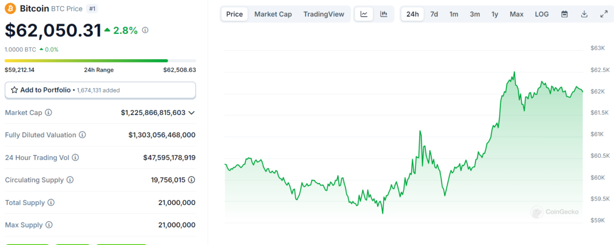 Bitcoin (BTC), son 24 saatte neredeyse %3’lük bir artış gösterdi. Bununla birlikte BTC şuan, 62.151 dolardan işlem görüyor. Gün içi en düşük seviyesi 59.218,25 dolar olarak kayıtlara geçti. En yüksek seviyesi ise 62.578,77 dolar oldu. Bu yükseliş, piyasada olumlu bir hava estirirken, yatırımcılar tarafından büyük bir iyimserlikle karşılandı.