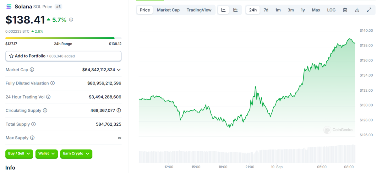 BTC fiyatındaki yükseliş diğer altcoinlere de yansıdı. Bununla birlikte Solana (SOL), %5 oranında değer kazanarak 138 dolara ulaştı. Gün içindeki en düşük ve en yüksek seviyeleri sırasıyla 127,25 dolar ve 138,25 dolar olarak kayıtlara geçti. SOL, son dönemlerde devler için sunduğu yazılım güncellemesiyle piyasadaki konumunu güçlendiriyor. Bu da Solana’ya olan talebin artmasına neden oluyor.
