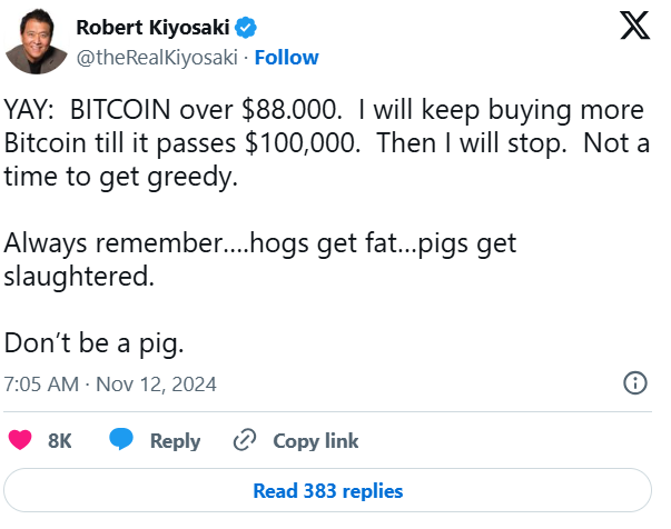 BITCOIN 88.000 doların üzerinde. Bitcoin 100.000 doları geçene kadar almaya devam edeceğim. Sonra duracağım. Şimdi açgözlü olma zamanı değil.