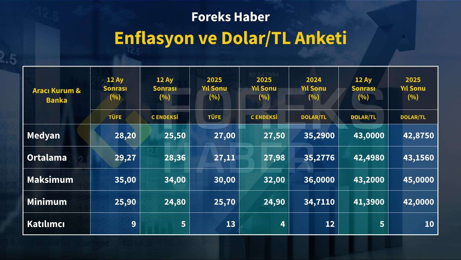 2024 sonu dolar/TL kuru anketine 12 ekonomist katılım sağladı. Medyan tahmin 35,2900 olurken, ortalama tahmin 35,2776 oldu. Kur için en yüksek ve en düşük tahminler sırasıyla 36,0000 ve 34,7110 olarak gerçekleşti. Ekim ayı Foreks Haber anketinde 9 ekonomistin yıl sonu dolar/TL kur beklentisi 36,0000 seviyesindeydi.