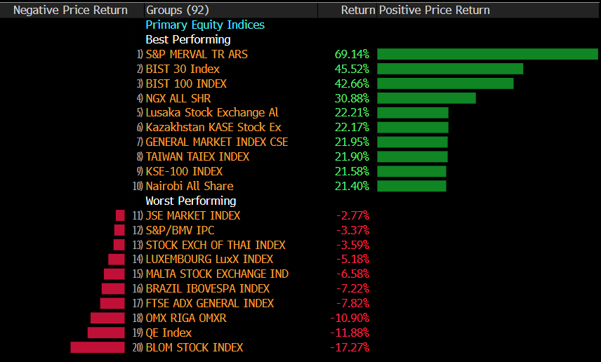 Borsa İstanbul 100 endeksi yıl başından bu yana sergilediği performans ile göz doldurdu. Gelişen / Gelişmiş fark etmeksizin iyi bir reaksiyon verdi. Lokal para cinsinden %43, $ cinsinden ise %31 ile en iyiler arasında yer almaktadır.