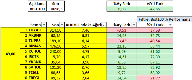 Bist100 endeksinde ağırlığı en yüksek 10 şirketin toplam endeks içerisindeki oranına baktığımızda neredeyse yarısını temsil ediyor. %49büyük bir ağırlık olarak izah edilebilir. Ağırlığı en yüksek şirketler sırasıyla THYAO, AKBNK, TUPRS, BIMAS, KCHOL, ISCTR, YKBNK, SAHOL, TCELL, EREGL olarak kaydedilmiştir.