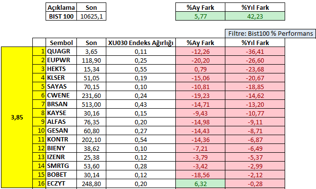 Bu arada Negatif Performans Sergileyen 15 şirketin toplam endeks içerisindeki ağırlığı SADECE %3,85.