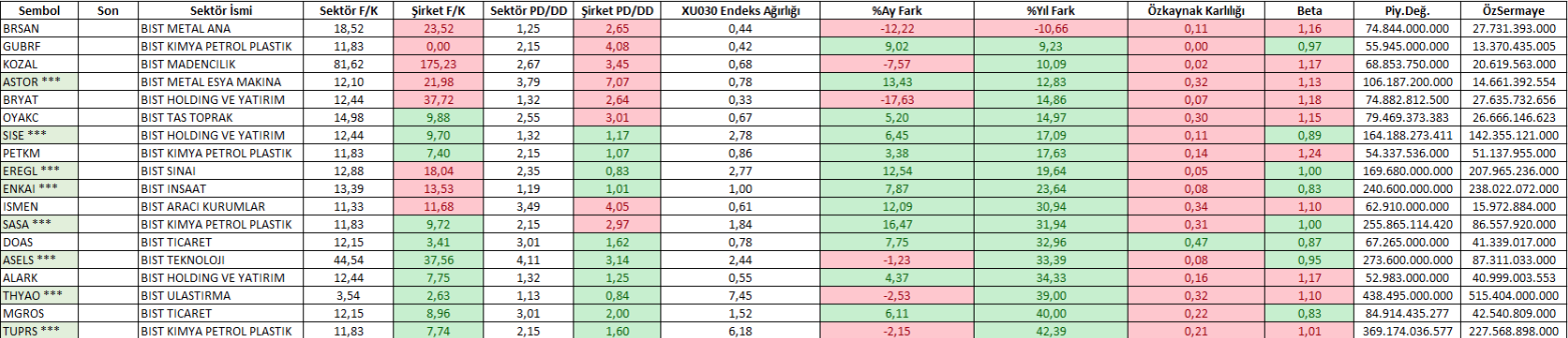 Filtremizi devam ettirecek olursak, mevcut 18 şirketi hem Şirket hem de Sektör F/K, PD/DD kıyaslaması Özkaynak Karlılığının TÜFE ile karşılaştırılması, endeks hareketlerine göre risk parametresi nedir hususunda da Beta gibi bölümleri ekledik. Karşımıza çıkan tablo aşağıdaki gibidir.