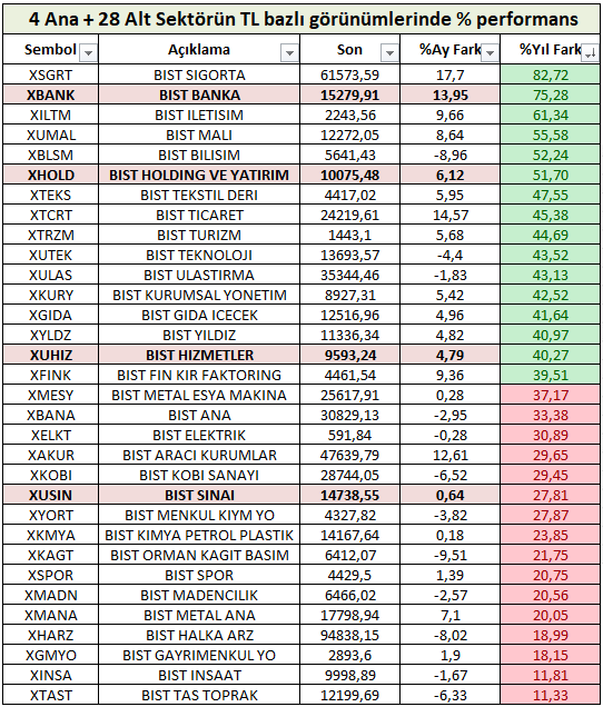 Endeks performanslarından sektörlere geçtiğimizde yıl başından bu yana lokal para cinsinden en iyi performans sergileyenler Sigorta, Banka ve İletişim olarak görülmektedir. Tablo içerisinde yer alan yeşil renkli sektörler TCMB Yıl sonu Enflasyon beklentisi olan  %38 oranı üzerinde, kırmızı renkli sektörlerse doğal olarak Enflasyon rakamı altında kalanlar olarak izah edilebilir.