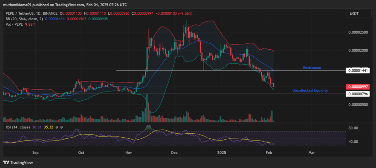 Eğer PEPE, alt Bollinger bandındaki 0.00000906 dolar desteğini kaybederse, bir sonraki likidite bölgesi olan 0.00000796 dolara kadar düşebilir.