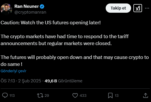 Yükselen ticaret savaşı ve 2025’in büyük kısmı için yüksek faiz oranlarının öngörülmesiyle birlikte, yatırımcılar riskli varlıklardan kaçıp ABD devlet tahvillerine yöneldi. Analist Van Nuener’a göre, 2 Şubat’ta ABD vadeli işlemler piyasalarının açılmasıyla birlikte kripto piyasalarında tekrar bir düşüş yaşanabilir.