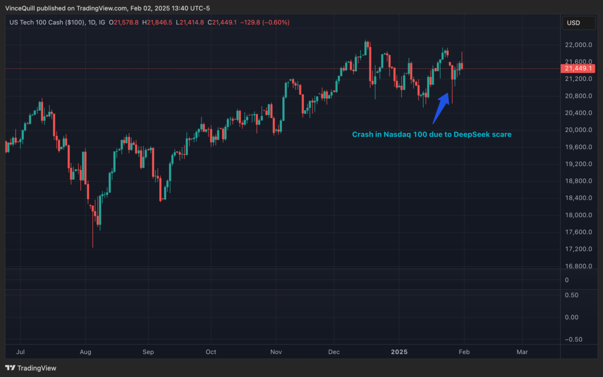 DeepSeek R1’in yayımlanmasının ardından Nasdaq 100 endeksindeki çöküş piyasanın gündeminde yer alan gelişmeler arasındaydı. DeepSeek beyaz kağıdına göre, bu model, OpenAI modelleriyle eşdeğer performans sergiliyor, ancak çok daha düşük bir maliyetle eski bilgisayar donanımları kullanılarak eğitildi.