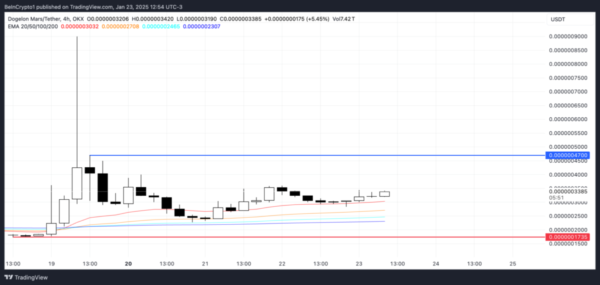 ELON, haftalardır devam eden yatay hareketin ardından 19 Ocak’ta değerini ikiye katladı ve 2022’den bu yana en yüksek seviyesine ulaştı. Teknik analizlere göre, destek seviyesi 0.0000001735 olarak belirlenmiş durumda. Ancak yukarı yönlü momentum devam ederse, fiyatın 0.00000047 seviyesine, hatta 0.00000050 seviyesine kadar yükselmesi muhtemel.