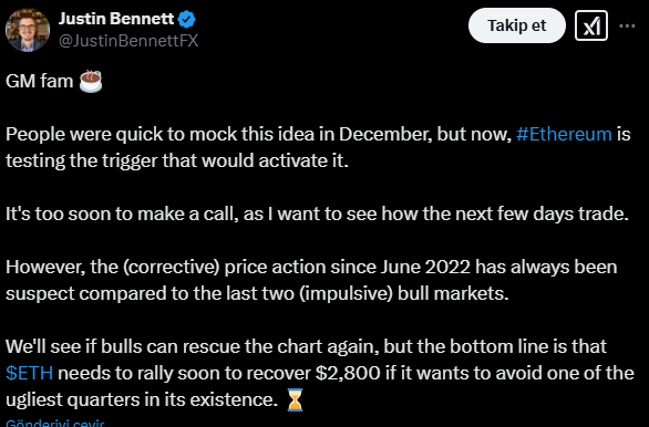 Bennett, fiyatın mevcut trend çizgisinin altına düşmesi durumunda Ethereum’un en kötü çeyreklerinden birini yaşayabileceğini vurguluyor. Eğer boğalar bu seviyeyi geri alamazsa, satış baskısı artabilir ve aşağı yönlü hareket hızlanabilir.