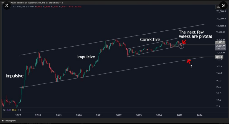 Kripto analisti Justin Bennett, Ethereum’un mevcut piyasa yapısını koruyabilmesi için hızla 2.800 dolar seviyesini geri kazanması gerektiğini belirtiyor. Analizlerine göre, Haziran 2022’den bu yana Ethereum fiyat hareketleri daha çok düzeltme aşamalarına odaklandı ve önceki boğa piyasalarında görülen güçlü yükseliş ivmesi eksik kaldı.