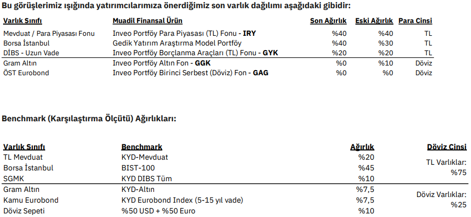 TCMB’nin politika faizinin %50 seviyesinde tutmaya devam etmesi nedeniyle, TL mevduat / para piyasası fonlarına portföyümüzde %40 ağırlıkla yer vermeye devam ediyoruz.