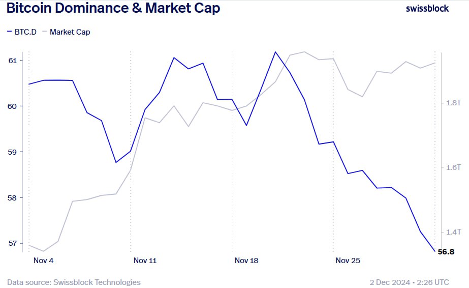 Altcoin sezonu kızışıyor! Bitcoin’in hakimiyeti düşüyor, ama tahmin edin ne oluyor? Piyasa değeri düşmüyor! Rüya senaryo gerçekleşiyor: BTC, hakimiyeti düşerken tırmanmaya devam ediyor. Bu, Bitcoin’in altcoinleri yeni zirvelere çıkarmasıyla, altcoin denizinin gelişmesi için mükemmel bir kurulum!
