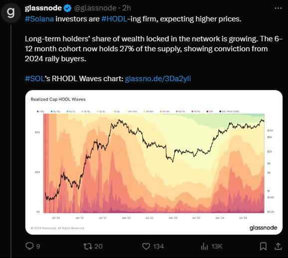 Son raporlara göre Solana (SOL) yatırımcıları, satıştan uzak uzun vadeli beklemeyi tercih ediyor. Raporlar, yatırımcıların büyük bir kısmının uzun vadeli fiyat artışları beklediğini gösteriyor. On-chain veriler, 2024 yılındaki ralliler sırasında alınan SOL’lerin hala satılmadığını ortaya koydu.