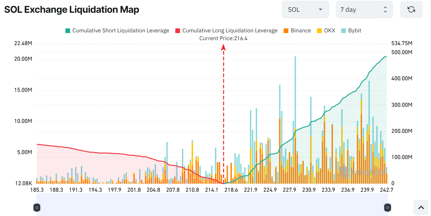 Solana’nın fiyatı, yuvarlak zirve formasyonu oluşturdu. Bu da ayıların piyasada hâkim olduğunu gösteriyor. Formasyonun “boyun çizgisi” 215 dolar seviyesinde bulunmakta. SOL bu seviyeyi defalarca test etti. Eğer bu destek tutulamazsa, analistlere göre Solana’nın fiyatı 200 dolar seviyesinin altına düşecek. Satıcılar daha sonra 183 dolar seviyelerine kadar baskı yapacak. Bu durum, daha fazla uzun pozisyon tasfiyesini tetikleyebilir.