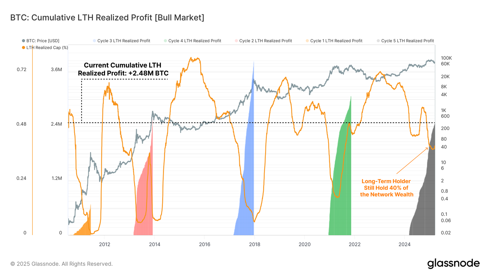 BTC kümülatif LTH gerçekleşen kârı (boğa piyasası). Kaynak: GlassnodeBoğa piyasaları genellikle uzun vadeli holderlar arasında güçlü kar alımlarıyla sınırlanır. Bu da düşüş davranışına tam bir geçişe işaret eder. Ancak, Bitcoin’in son haftalardaki dalgalanmasına rağmen, LTH grubu kârlarının büyük bir kısmını korumaya devam ediyor. Bu durum, uzun vadeli holderların yılın ilerleyen dönemlerinde hala yeni bir ralli bekliyor olabileceğini gösteriyor.
