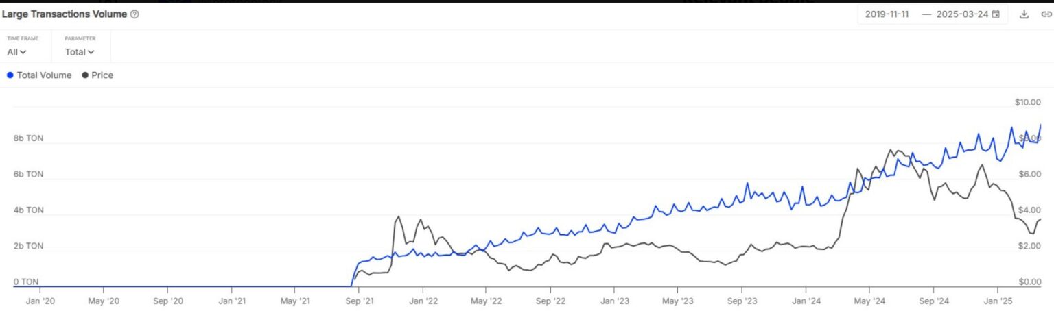 TON, son 24 saatte %5.5’lik artışla piyasadaki çoğu altcoini geride bıraktı. Bu yükselişi tetikleyen en önemli faktör ise balina hareketliliği oldu. IntoTheBlock verilerine göre büyük işlemler geçtiğimiz hafta 34 milyar dolara ulaştı. Bu veri, TON’a olan kurumsal ve yüksek hacimli yatırımcı ilgisini ortaya koyuyor.
