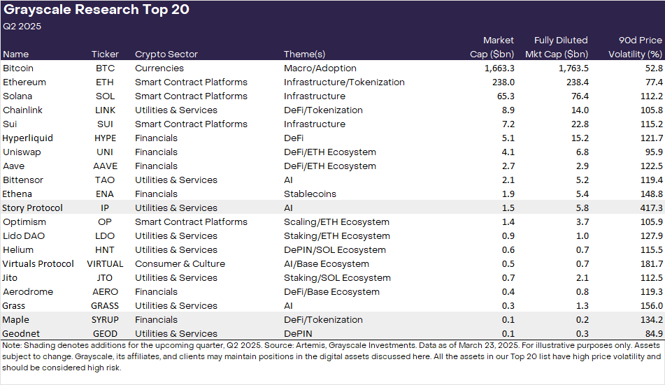 2025’in ikinci çeyreği için Grayscale, blockchain teknolojisinin spekülatif olmayan kullanım alanlarını yansıtan üç ana kategoriye ait altcoin projelerine odaklanacağını belirtti. Bunlar, Gerçek Dünya Varlıkları (RWA), Merkeziyetsiz Fiziksel Altyapı (DePIN) ve Fikri Mülkiyet (IP) tokenları olarak sıralandı. Bu çeyrek için listeye üç yeni varlık eklendi: Maple (SYRUP), Geodnet (GEOD) ve Story (IP). Grayscale’in 2025 yılı ikinci çeyreğinde belirlediği Bitcoin ve en iyi 19 altcoin şu şekilde sıralandı: