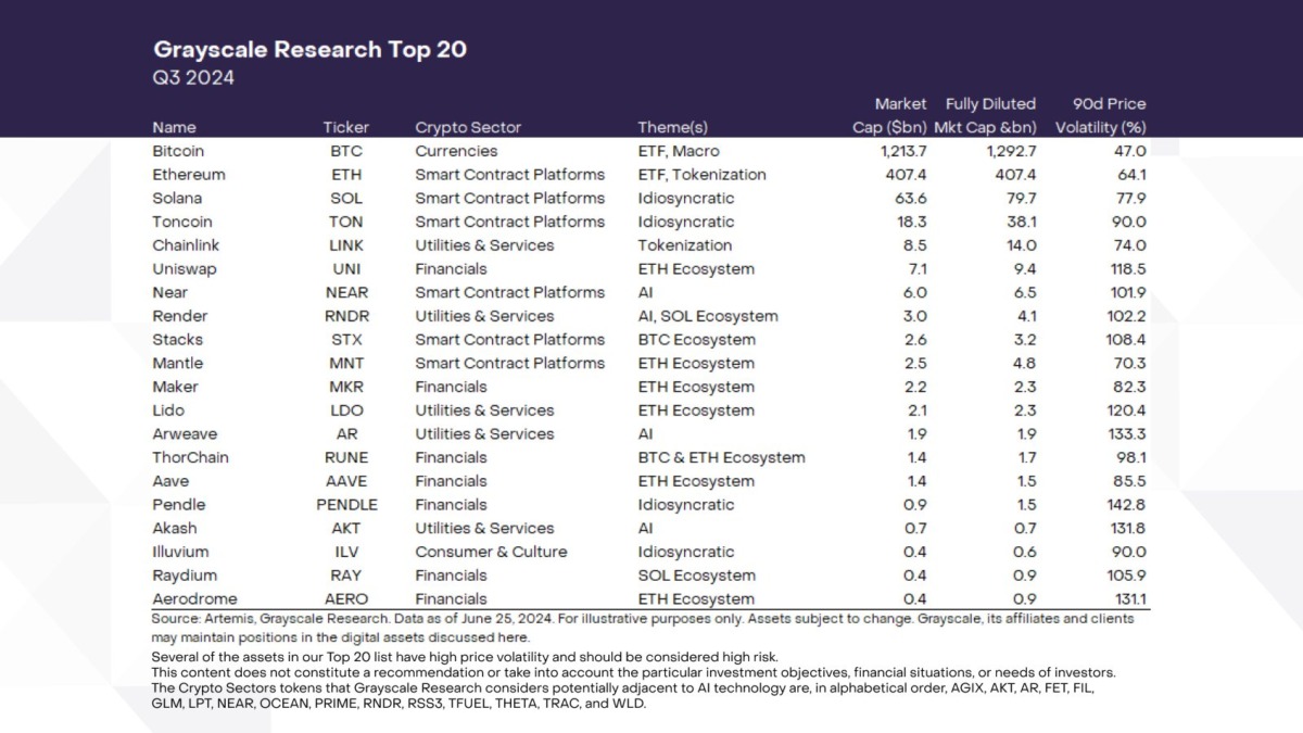 Grayscale Araştırma ekibi, AI temasının önemini korumasını ve spot ETH ETP onayı beklentisi nedeniyle kripto piyasalarının 2024 yılının 3. çeyreğinde Ethereum ekosistemine yoğun bir şekilde odaklanmasını bekliyor. Grayscale, Blockchain teknolojisi ve yapay zeka arasındaki kesişimin önümüzdeki çeyrekte odak noktası olacağını öngörüyor ve Near ve merkezi olmayan GPU pazarları gibi varlıkları vurguluyor. Raporda ayrıca üçüncü çeyrek için yüksek potansiyelli projeler listeleniyor. Bunların yüksek riskli varlıklar olduğu konusunda uyarıda bulunuluyor. Bu bağlamda Grayscale, aşağıdaki listeyi paylaşıyor.