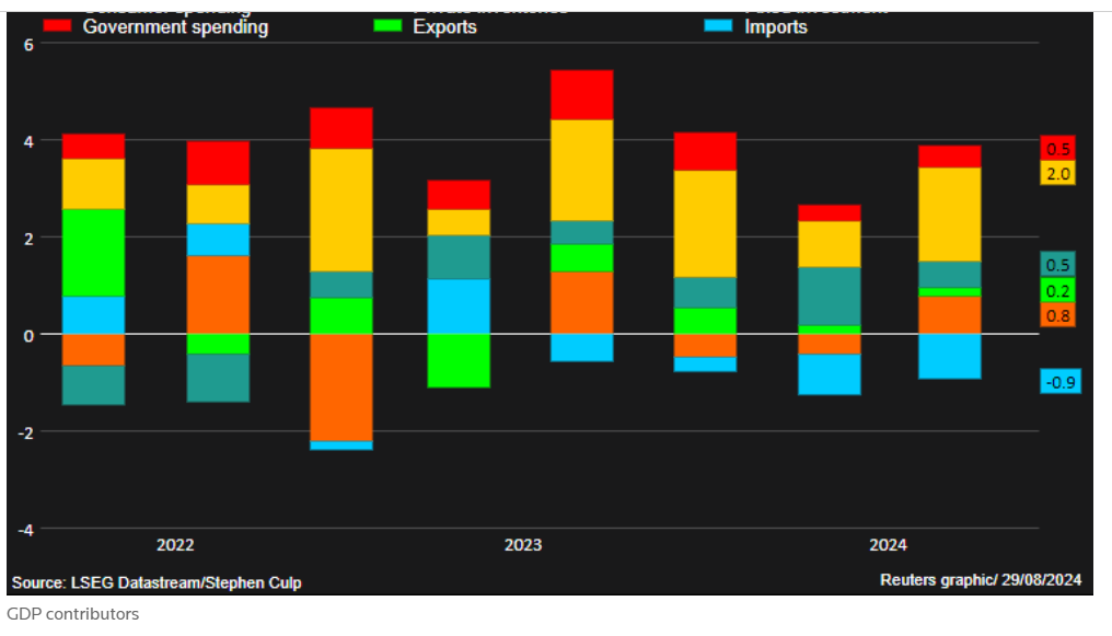 BEA açıklamasında, “İlk çeyreğe kıyasla, ikinci çeyrekte reel GSYİH’deki hızlanma, öncelikle özel envanter yatırımlarındaki yükselişi ve tüketici harcamalarındaki hızlanmayı yansıtıyor” dedi. “Bu hareketler, konut sabit yatırımlarındaki gerilemeyle kısmen dengelendi.” GSYH  fiyat deflatörü ikinci çeyrekte %0,1’lik yukarı yönlü revizyonla %2,4 arttı.  Atlanta Fed’in yakından takip edilen nowcast’i, ekonominin 3cü çeyrekte yıllık %2 büyümesi  öngörüyor.