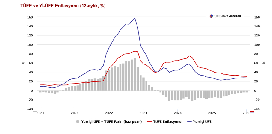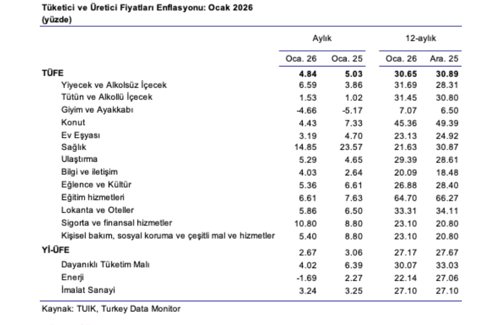 Ocak ayı enflasyon verisi, Türkiye’nin içine sıkıştığı yüksek ve yapışkan enflasyon rejiminin direncini bir kez daha gösterdi. Tüketici fiyatları aylık bazda %4,8 ile beklentilerin belirgin biçimde üzerine çıktı. Yıllık enflasyon ise ancak %30,9’dan %30,7’ye gerileyebildi. Üretici fiyatlarında da tablo çok farklı değil; aylık %2,7 artışla yıllık oran %27,2’ye gerilese de maliyet baskılarının hâlâ güçlü olduğu açık.