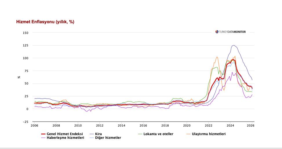 Hizmetler cephesi ise tabloyu daha net anlatıyor. Hizmet enflasyonu yıllık bazda %44’ten %40,4’e gerilemiş durumda. Kâğıt üzerinde bu düşüş “cesaret verici” görünebilir. Ancak %40’lık bir hizmet enflasyonu fiyatlama davranışlarının bozulmuş olduğunu gösterir. Üstelik aylık eğilimlere bakıldığında, mevsimsellikten arındırılmış hizmet enflasyonu hizmet enflasyonunun hâlâ %2,7 ile çok yüksek. Beklentilerin bozukluğu geriye endekslemenin adet olduğu hizmet fiyatları enflasyonunu yüksek tutuyor.