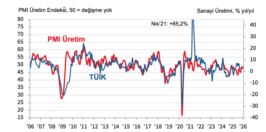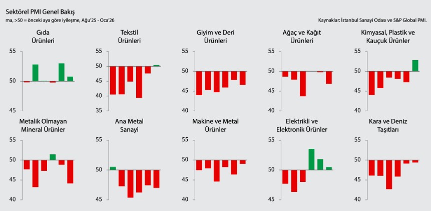 Ocak ayı Türkiye Sektörel PMI verisi, kırılganlığı yüksek bir tabloya işaret ediyor. Yeni siparişlerde anlamlı bir toparlanma yok. Artış sadece kimyasal, plastik ve kauçuk sektöründe görülmüş. Geri kalan sektörlerde siparişler zayıf. Yeni siparişlerde belirgin bir toparlanma olmazsa, üretimde görülen bu zayıf büyümenin önümüzdeki aylarda kalıcı olması zor.