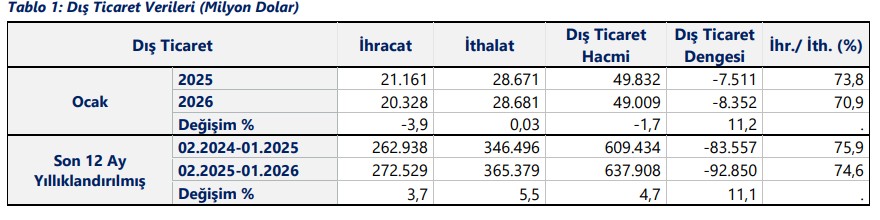 Detaylarda, ocak ayında ihracat önceki yılın aynı ayına göre %3,9 düşerek 20,3 milyar dolara gerilerken ithalat ise neredeyse değişmeyerek 28,7 milyar dolar civarında kaldı. Ocak en çok ihracat kalemi olan ara mallar 10,2 milyar dolarla %4,4 geriledi, tüketim malları ihracatı 7 milyar dolarla %10,6 daraldı ancak yatırım malları %5,8 artarak 2,6 milyar dolar oldu.