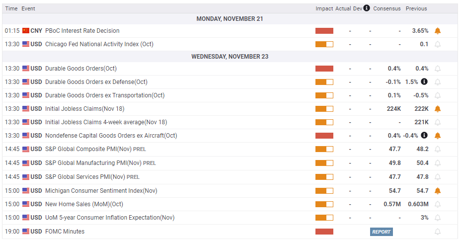 ABD’de hisse senedi ve tahvil piyasaları 24 Kasım Perşembe günü kapalı olacak. Ayrıca, Şükran Günü münasebetiyle Cuma günü erken saatlerde kapanacak. Tüm önemli ABD verileri önümüzdeki hafta Çarşamba günü açıklanacak. Bu nedenle, yatırımcıların bunlar arasında gezinmesi kolay olmayacak. S&P Global, Kasım ayı ön Üretim ve Hizmet PMI anketlerini yayımlayacak. Eylül’deki 49,3 olan Hizmetler PMI Ekim’de 47,8’e geriledi. Böylece, hizmet sektöründeki ticari aktivitenin hızlanarak daralmaya devam ettiğini gösterdi. Analist, verilerin etkisi için şu değerlendirmeyi yapıyor: