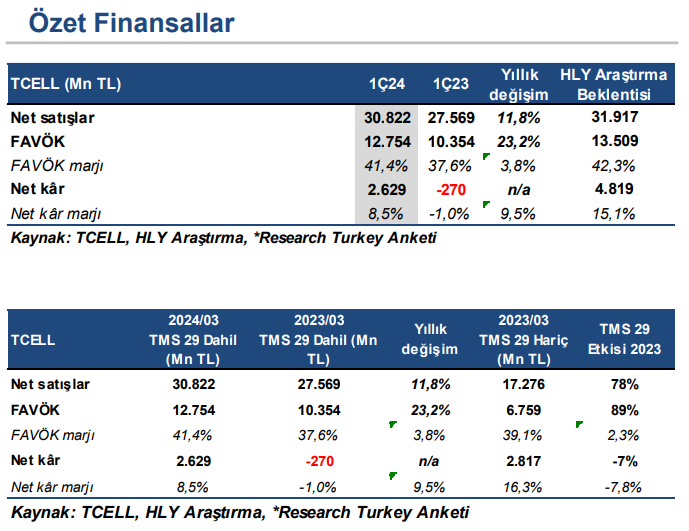 TMS 29 etkisi dahil edildiğinde, Turkcell’in konsolide cirosu 1Ç24’te %11,8 reel büyüme kaydederek 30,82 mlr TL ile kurum beklentimize paralel gerçekleşti. Artan abone bazı ve fiyat düzeltmeleri ciro artışında belirleyici oldu. Bu arada 17,28 mlr TL olan 1Ç23 cirosu, enflasyon muhasebesi sonrası 27,57 mlr TL olarak revize edildi.