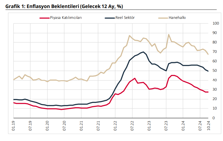 TCMB’den yapılan açıklamaya göre, Ekim ayında 12 ay sonrası yıllık enflasyon beklentileri, piyasa katılımcıları için 0,1 puan azalarak yüzde 27,4 seviyesine, reel sektör için 1,6 puan azalarak yüzde 49,5 seviyesine, hanehalkı için 4,4 puan azalarak yüzde 67,2 seviyesine geriledi.